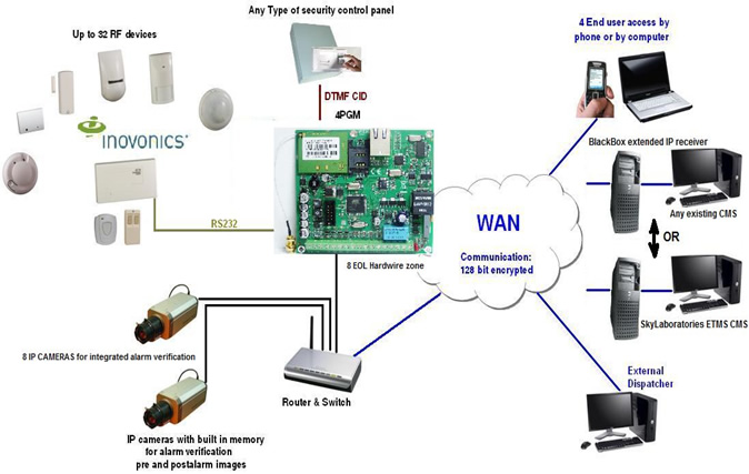 - Expansion with 32 RF devices (Inovonics 868MHz wireless *)